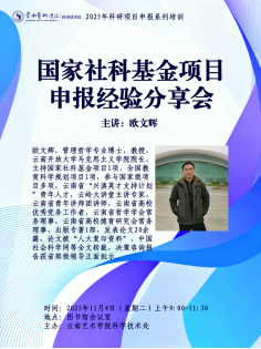 为进一步提升我校教师的人文社科科研能力,拓宽科研项目申报思路,云南艺术学院科技处特邀请云南开放大学马克思主义学院院长欧文辉教授,于11月4日上午在云南艺术学院图书馆会议室开展了主题为《人文社科项目申报经验分享——以国家社科基金项目申报为例》的学术讲座。讲座由科技处处长迟燕琼教授主持,科技处全体人员、教学单位教师和研究人员代表、有项目申报意向的研究人员等参加。